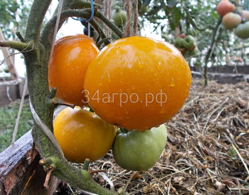 Среднеспелый (от полных всходов до начала созревания 109 дней) сорт салатного назначения. Растение индетерминантное, высота 120 -140 см. Первая кисть закладывается над 7-9 листом, последующие через 2-3 листа. Плоды плоскоокруглые, очень крупные, средней массой 300 г (отдельные до 900 г). В технической стадии – светло-зеленые с пятном у плодоножки, при созревании – желтые. Вкусовые качества хорошие. Рекомендуется для выращивания в открытом грунте как коловая культура. Агротехника. Посев на рассаду. Глубина заделки семян 1-2 см. При оптимальной температуре 20…25°С всходы появляются через 5 дней. Пикировка в фазе 2-3 настоящих листьев. Уход за растениями заключается в поливах по мере необходимости (особенно важно поливать томат перед цветением, с появлением завязей и вначале созревания плодов), прополках, рыхлении, подкормках.